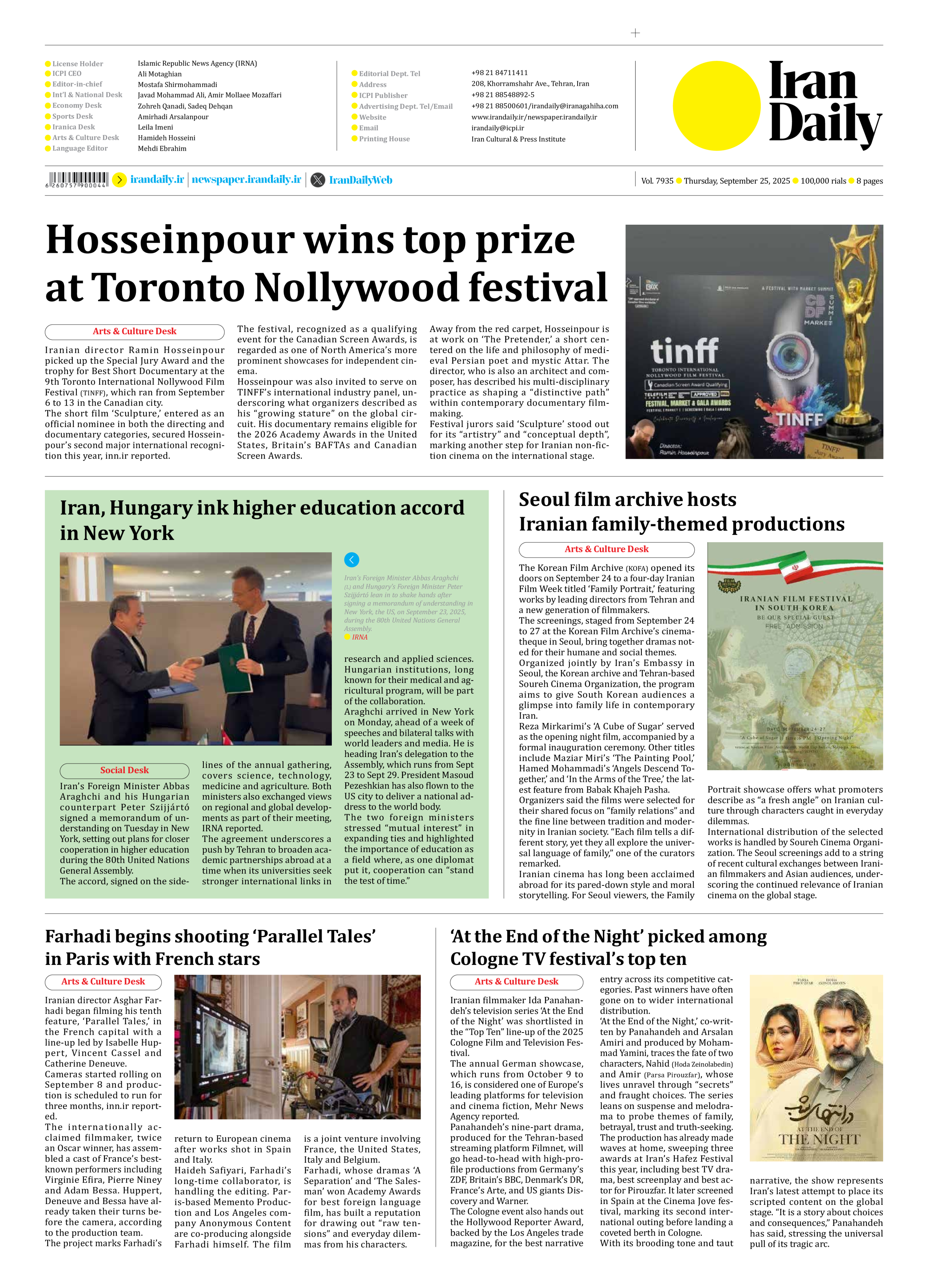 Hosseinpour wins top prize at Toronto Nollywood festival