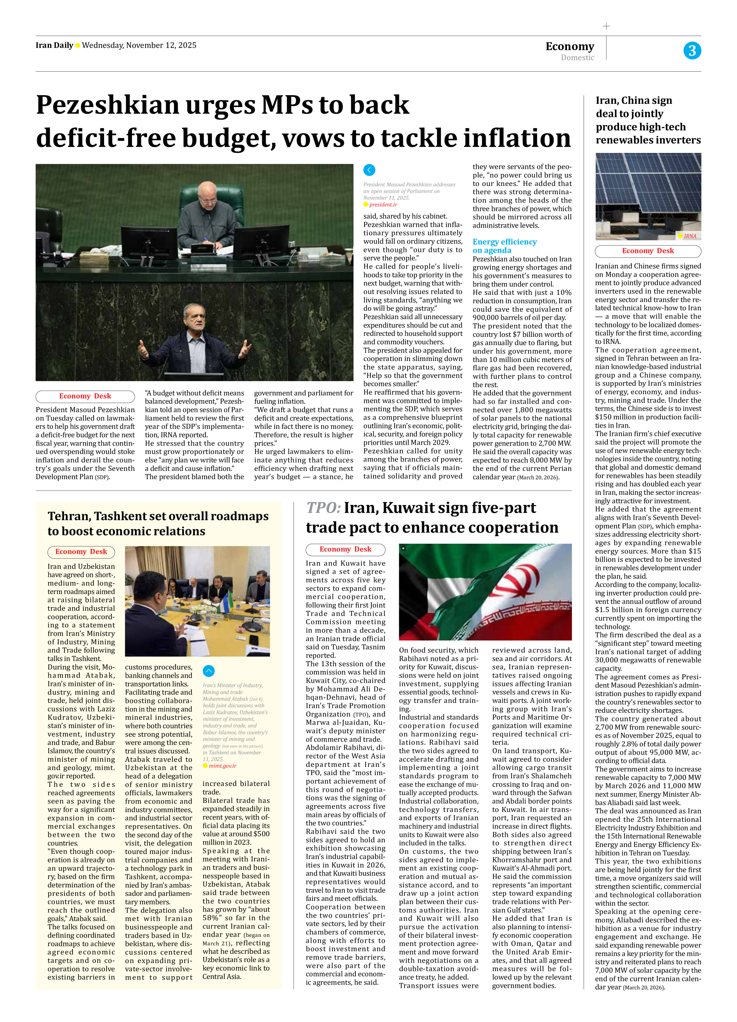 Pezeshkian urges MPs to back deficit-free budget, vows to tackle inflation