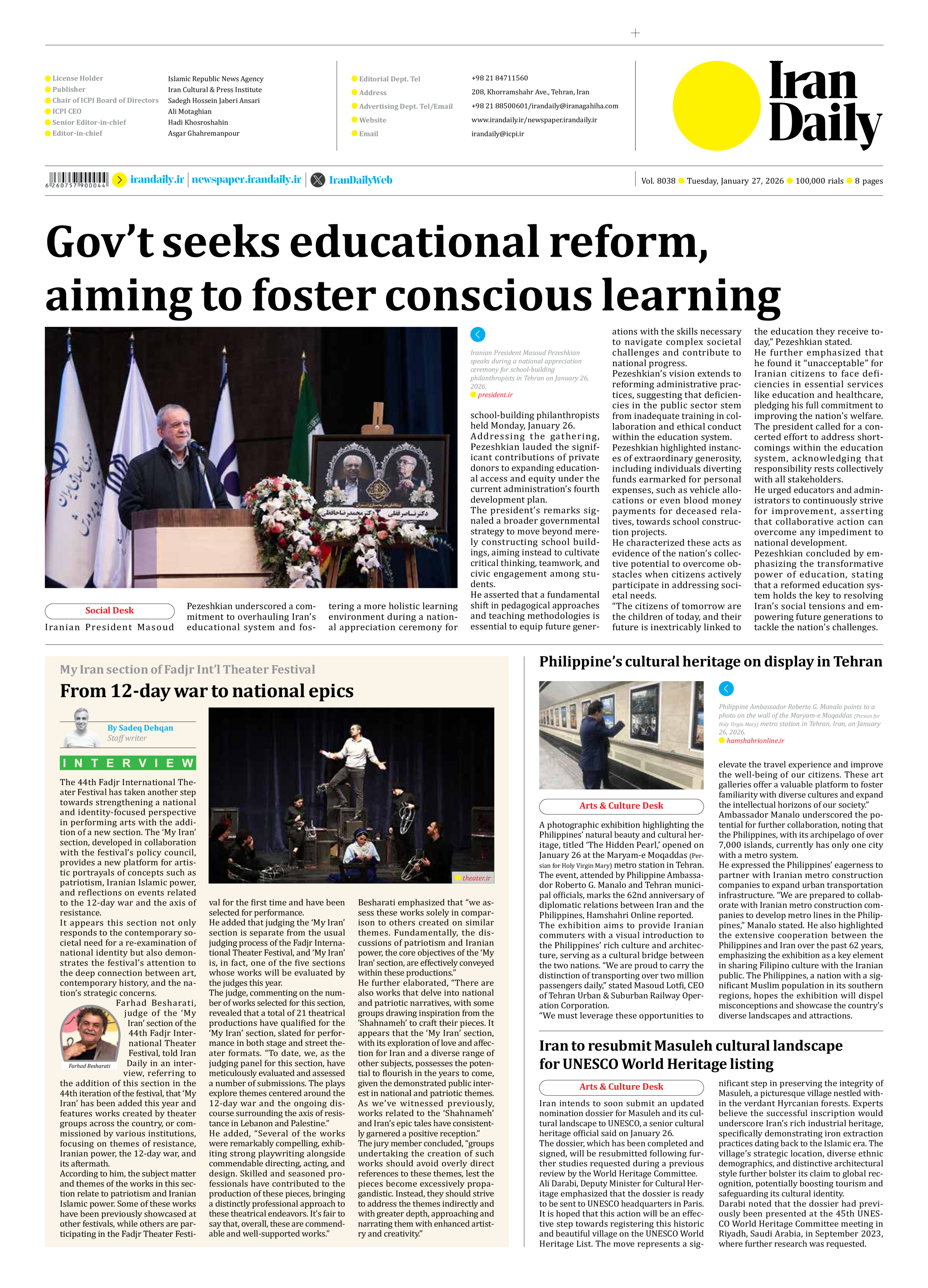 Farhad Besharati, judge of the ‘My Iran’ section of the 44th Fadjr International Theater Festival, told Iran Daily in an interview, referring to the addition of this section in the 44th iteration of the festival, that ‘My Iran’ has been added this year and features works created by theater groups across the country, or commissioned by various institutions, focusing on themes of resistance, Iranian power, the 12-day war, and its aftermath.