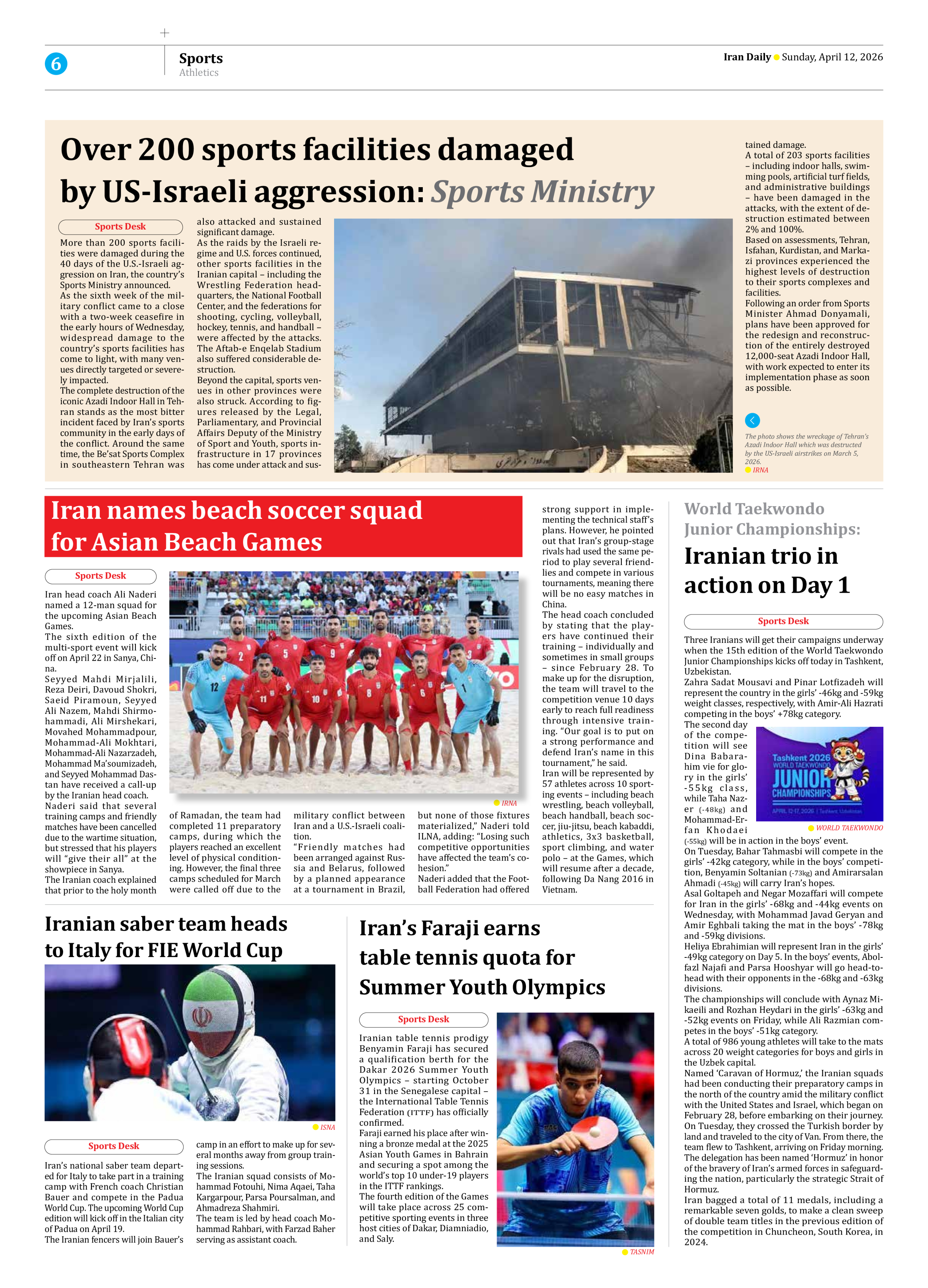 Over 200 sports facilities damaged by US-Israeli aggression: Sports Ministry